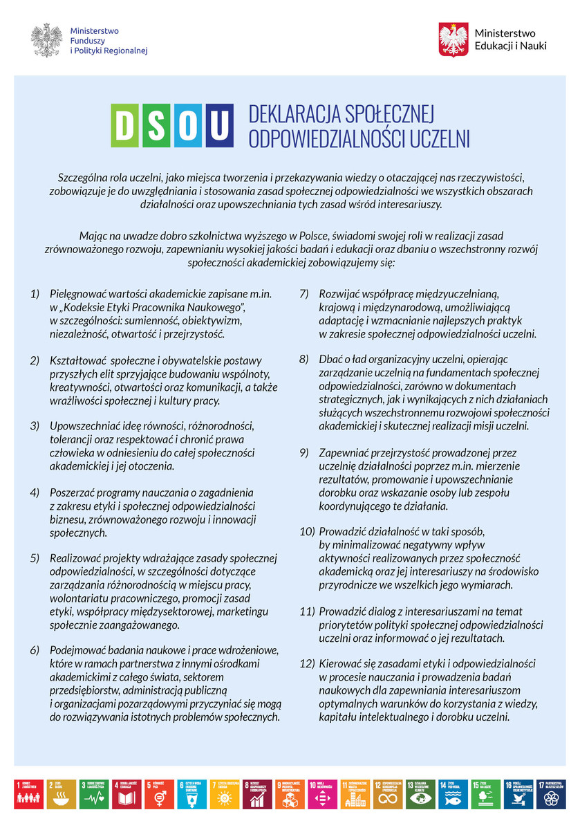 Deklaracja Społecznej Odpowiedzialności Uczelni została wypracowana w 2017 r. przez grupę roboczą ds. edukacji i popularyzacji CSR funkcjonującą w ramach Zespołu ds. Zrównoważonego Rozwoju i Społecznej Odpowiedzialności Przedsiębiorstw, organu pomocniczego ówczesnego ministra rozwoju, a obecnie ministra funduszy i polityki regionalnej. Dokument stanowi wyraz dobrowolnego zaangażowania się szkół wyższych w promowanie idei zrównoważonego rozwoju i społecznej odpowiedzialności w programach edukacyjnych, badaniach naukowych oraz w rozwiązaniach zarządczych i organizacyjnych uczelni. Jego celem jest budowanie szerokiej świadomości społecznej na temat roli uczelni w kształtowaniu warunków dla zrównoważonego rozwoju społeczno-gospodarczego kraju. 16 listopada 2017 r. w Ministerstwie Rozwoju (obecnym Ministerstwie Funduszy i Polityki Regionalnej) odbyła się konferencja pt. „Społeczna odpowiedzialność nauki – wyzwania dla środowiska akademickiego i biznesu”, podczas której 23 szkoły wyższe podpisały Deklarację SOU. W kwietniu 2019 r. podczas Kongresu Społecznej Odpowiedzialności Nauki – Nauka dla Ciebie w Krakowie kolejne 60 polskich uczelni podpisało dokument. Teraz do tego grona dołączyło 77 uczelni, co sprawiło, że łączna liczba sygnatariuszy Deklaracji SOU w latach 2017, 2019 i 2022 r. wynosi 160 uczelni.